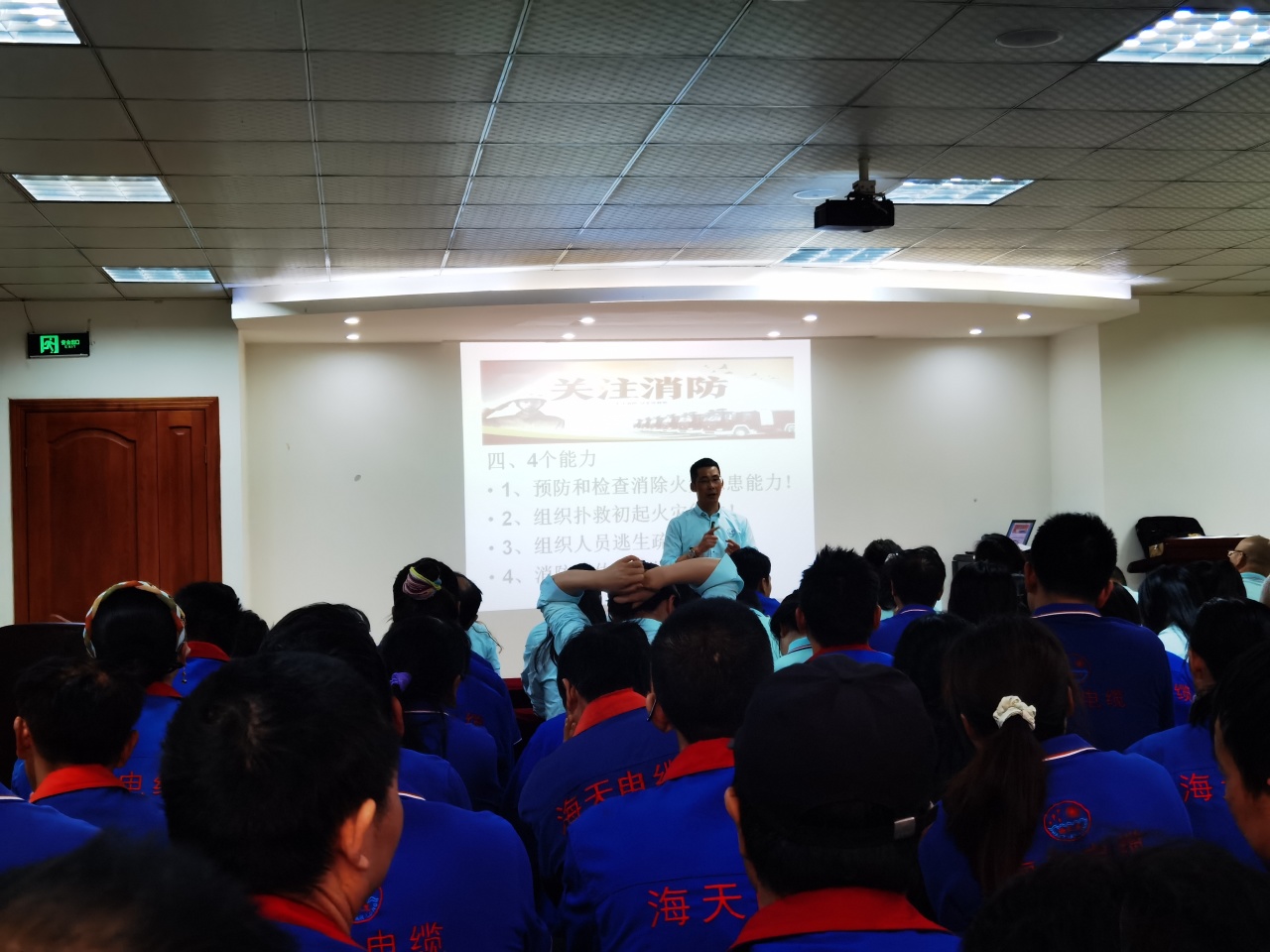 在培训环节,海天电缆生产副总陈冬宝为员工们详细讲解了火灾的危害、预防措施、逃生注意事项、灭火器及消防栓的使用方法,并通过视频展示了曾经惨痛的案例教训,使员工们深刻认识到火灾的严重危害和防范火灾的必要性。
