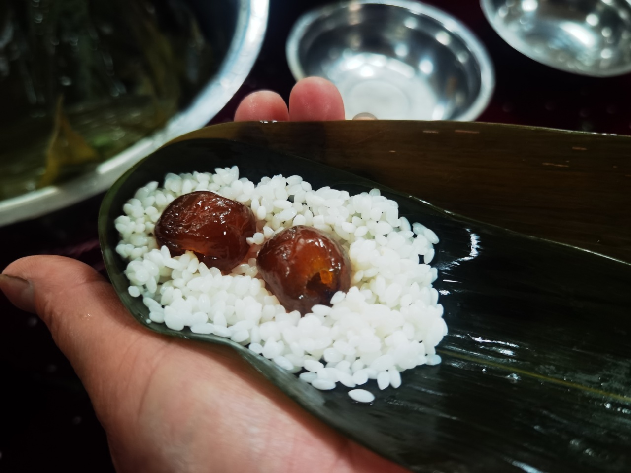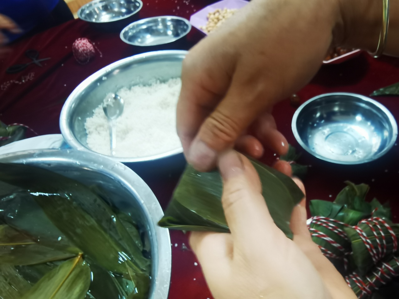端午佳节粽叶香,活动现场,桌子上整齐的摆放着粽子叶、糯米、火腿肉、蜜枣和扎绳等必备材料,来自生产车间和仓储部的包粽子高手向我们传授包粽子的技巧。