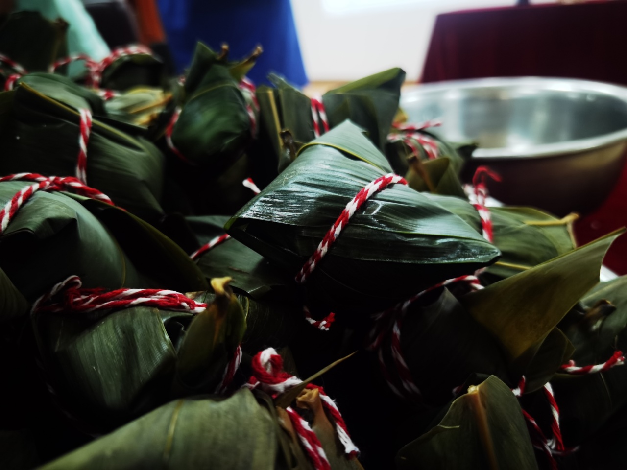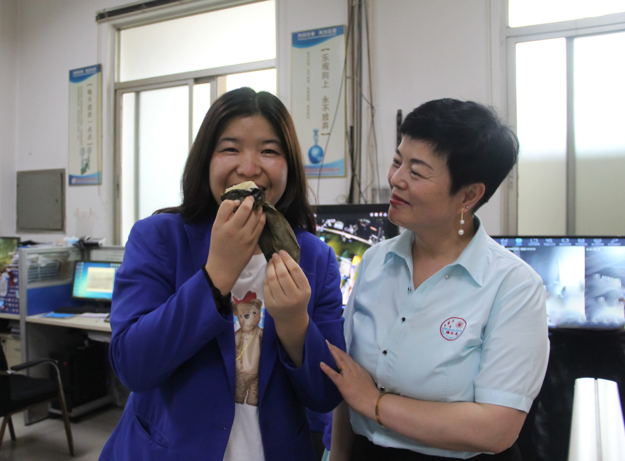 捋叶、填米、放枣、封口、扎绳,大家认真地学习,相互帮助,边学边包,慢慢地掌握了包粽子的技巧方法,手法也越来越娴熟,盆子包好的粽子越多越满。整个过程,大家唠着家常,说着心里话,一起体验着劳动的乐趣,活动现场一片欢声笑语,其乐融融。