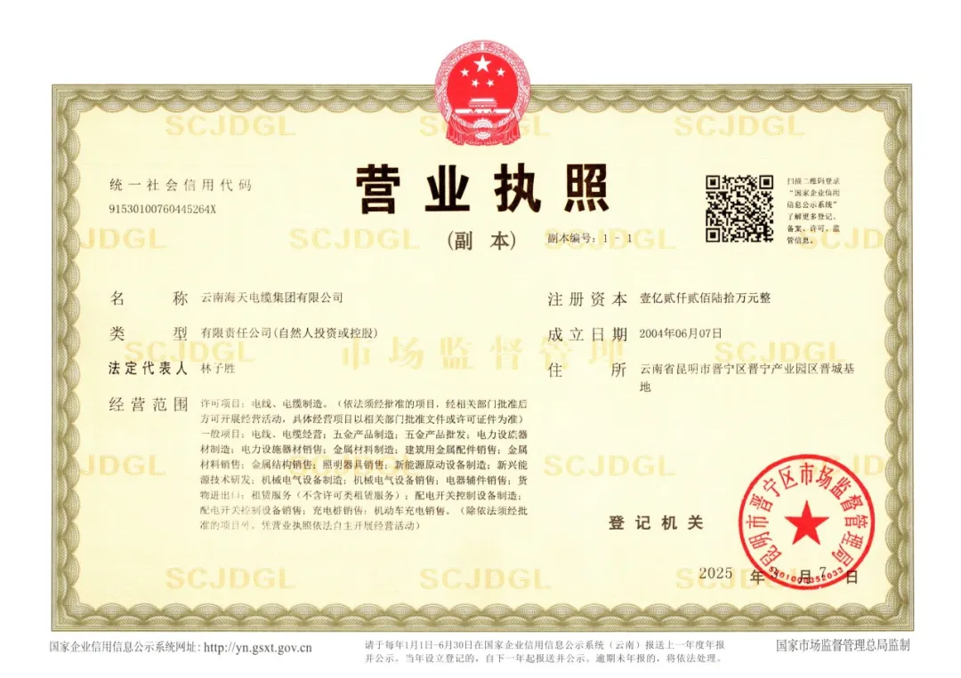 我们满怀欣喜向各界宣布:经市场监督管理部门核准,昆明海天电线电缆有限公司正式升级为云南海天电缆集团有限公司!